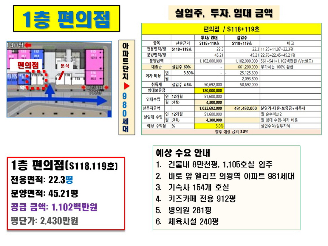 - 주변 아파트 4천5백 세대, 초등, 중등, 고등학교 주변 외부 수요