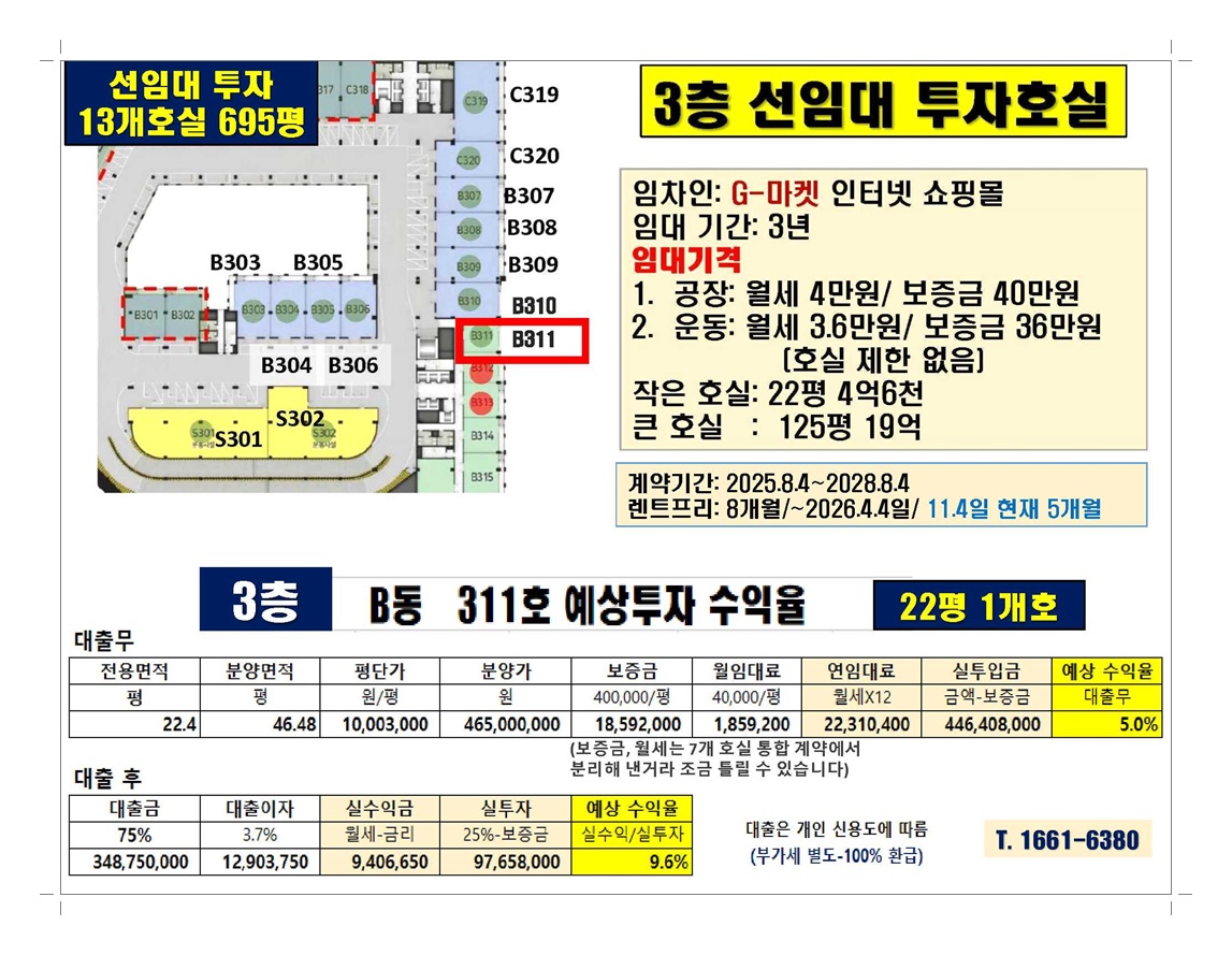3층 1개호: 전용 22평 금액 4억65백만원 실투자 9,800만원 실수익 940만원