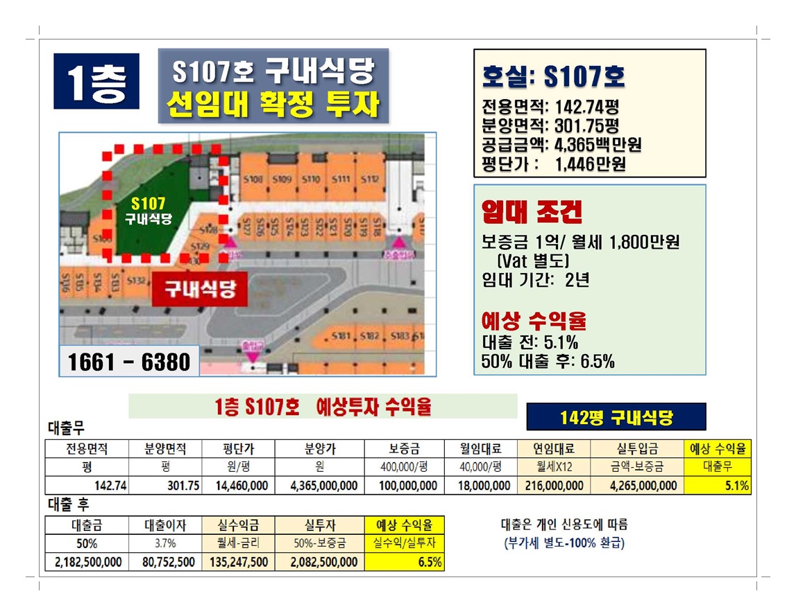 1층 구내 식당: 전용 142.7평 금액 43억6천 실투자 20억8천만원 실수익 1억3,500만